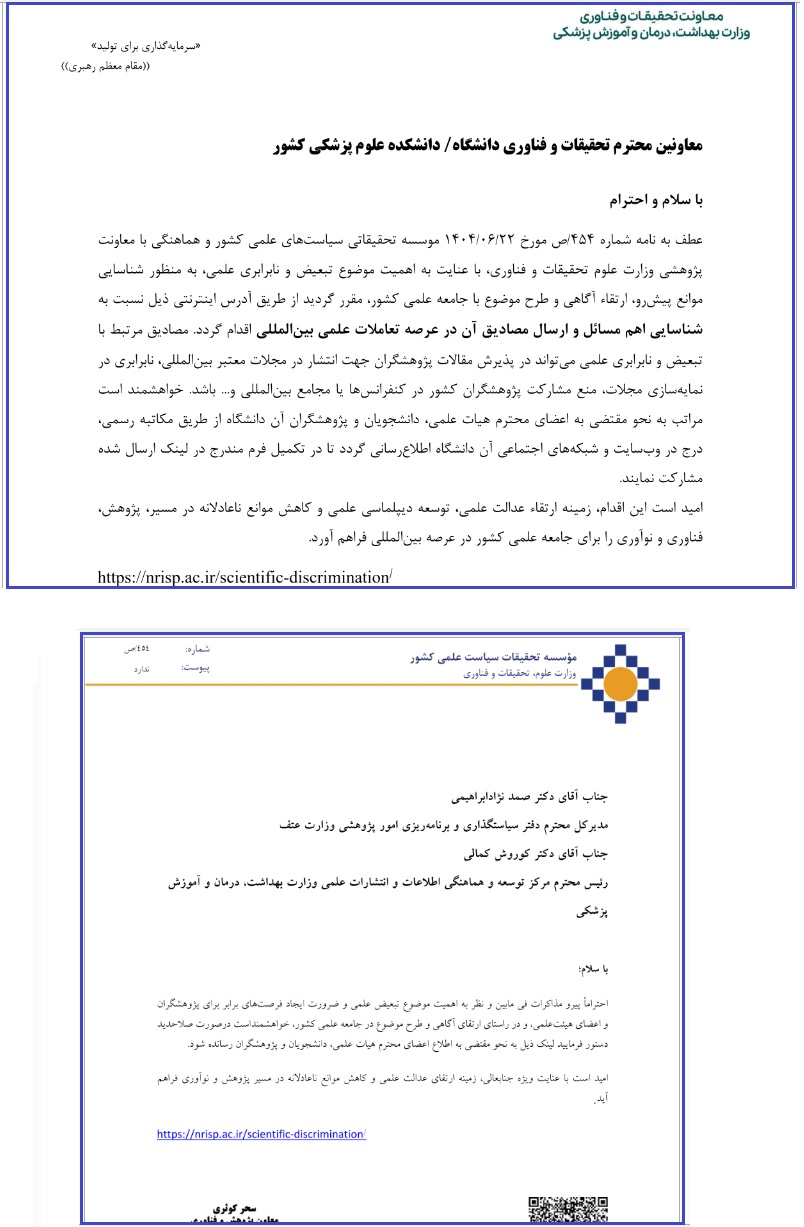 با عنایت به اهمیت موضوع تبعیض و نابرابری علمی، به منظور شناسایی موانع پیشرو، ارتقاء آگاهی و طرح موضوع با جامعه علمی کشور، به همت موسسه تحقیقاتی سیاستهای علمی کشور و هماهنگی با معاونت تحقیقات و فناوری وزارت بهداشت، مقرر گردیده است از طریق آدرس اینترنتی ذیل، نسبت به ثبت «شناسایی اهم مسائل و ارسال مصادیق آن در عرصه تعاملات علمی بینالمللی» اقدام گردد.