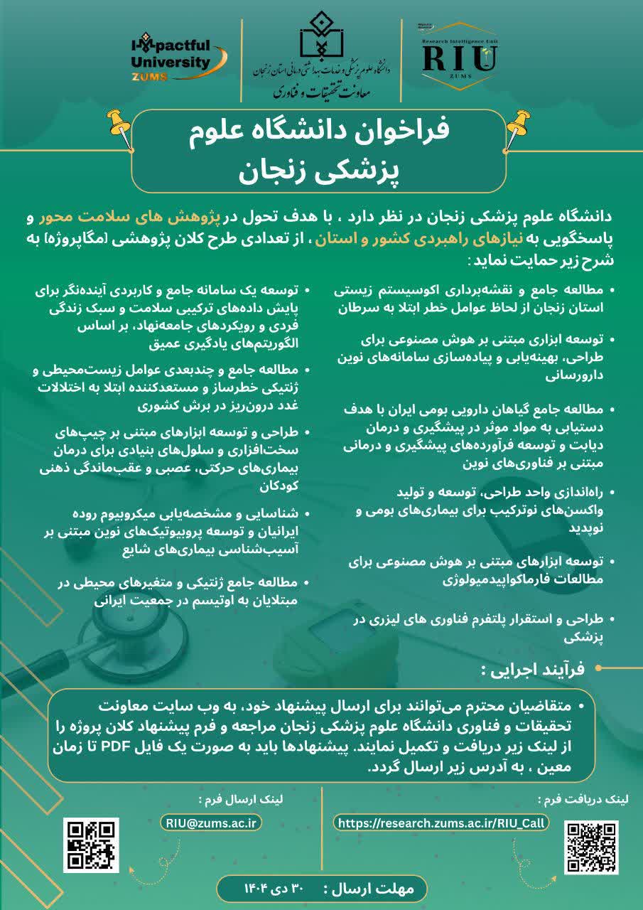 متقاضیان محترم میتوانند جهت ارسال پیشنهاد خود، با مراجعه به وبسایت معاونت تحقیقات و فناوری دانشگاه علوم پزشکی زنجان و بر اساس راهنمای متقاضیان، نسبت به دریافت و تکمیل فرم پیشنهاد اولیه کلانپروژه اقدام نمایند. پیشنهادها باید به صورت یک فایل PDF تا 30 دی ماه 1404، به آدرس RIU@zums.ac.ir ارسال گردد.
